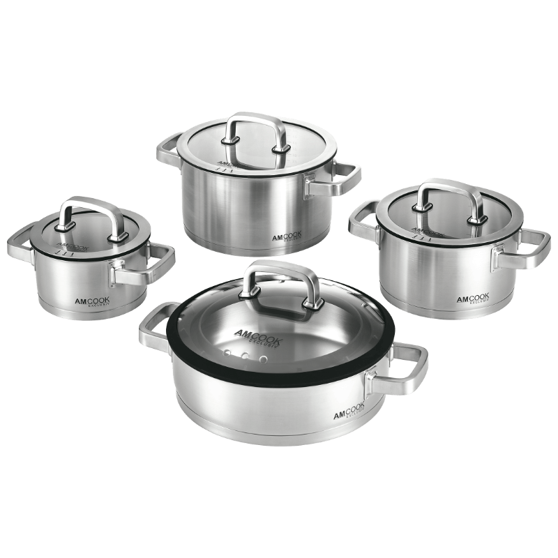 Das 8-teilige Kochgeschirr-Set besteht aus einem 16 cm großen Saucentopf mit Deckel, einem 20 cm großen Topf mit Deckel, einem 24 cm großen Suppentopf mit Deckel und einer 28 cm großen Servierpfanne mit Deckel. Alle Teile sind aus hochwertigem extrem langlebigen 18/10 Edelstahl gefertigt und mit einem mehrschichtigen Boden versehen, der auf jeder Art von Herdplatte, einschließlich Induktion, eine schnelle und gleichmäßige Wärmeverteilung gewährleistet. Die Kaltgriffe garantieren eine sichere und komfortable Handhabung. Mit dem Klarglasdeckel mit integriertem Dampfablass und dem innovativen Gourmetdeckel haben Sie ein komplettes Set, das Ihnen viele Jahre Freude bereitet.