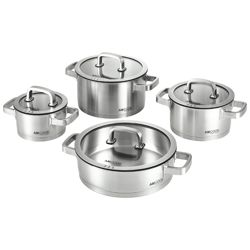 Das 8-teilige Kochgeschirr-Set besteht aus einem 16 cm großen Saucentopf mit Deckel, einem 20 cm großen Topf mit Deckel, einem 24 cm großen Suppentopf mit Deckel und einer 28 cm großen Servierpfanne mit Deckel. Alle Teile sind aus hochwertigem extrem langlebigen 18/10 Edelstahl gefertigt und mit einem mehrschichtigen Boden versehen, der auf jeder Art von Herdplatte, einschließlich Induktion, eine schnelle und gleichmäßige Wärmeverteilung gewährleistet. Darüber hinaus verfügen die Töpfe und die Pfanne über einen speziellen Schüttrand und alle Glasdeckel sind mit integriertem Dampfauslass versehen. Sie können den Inhalt beim Kochen somit komfortabel im Auge behalten, ohne den Deckel anheben zu müssen.