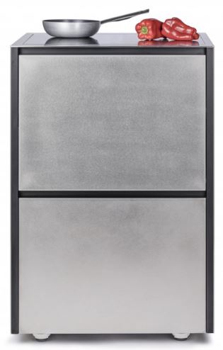 Der Küchenwagen aus mattem Edelstahl der Serie ONO mit Induktionsplatte 4 Zonen und zwei Schubladen. Die Schubladen sind grifflos und können zur Reinigung einfach ausgeklinkt werden. Die Arbeitsplatte aus 4 mm Voll-Edelstahl ist robust und widerstandsfähig. Schwarzes Innenleben. Das Modul steht auf versteckten Rollen (mit Feststellfuß und Höhenjustierung). Das Anschlußkabel befindet sich unter dem Boden des Wagens.