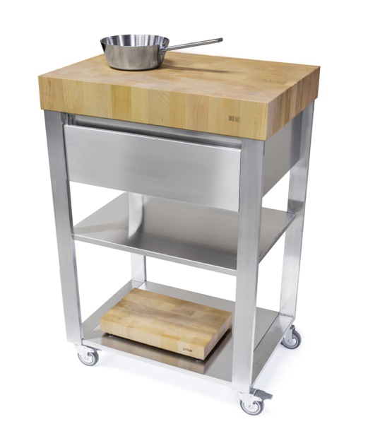 CUN light ___ Küchenwagen aus Edelstahl mit zwei Ablagen und einer Schublade. Die Arbeitsplatte aus Weißbuche Stirnholz ist robust und widerstandsfähig. Die Schublade ist grifflos und kann zur Reinigung ausgeklinkt werden. Der Küchenwagen hat links und rechts je ein Stecksystem zur Bestückung von Zubehör oder zum Einhängen einer Verbindungsbrücke.
