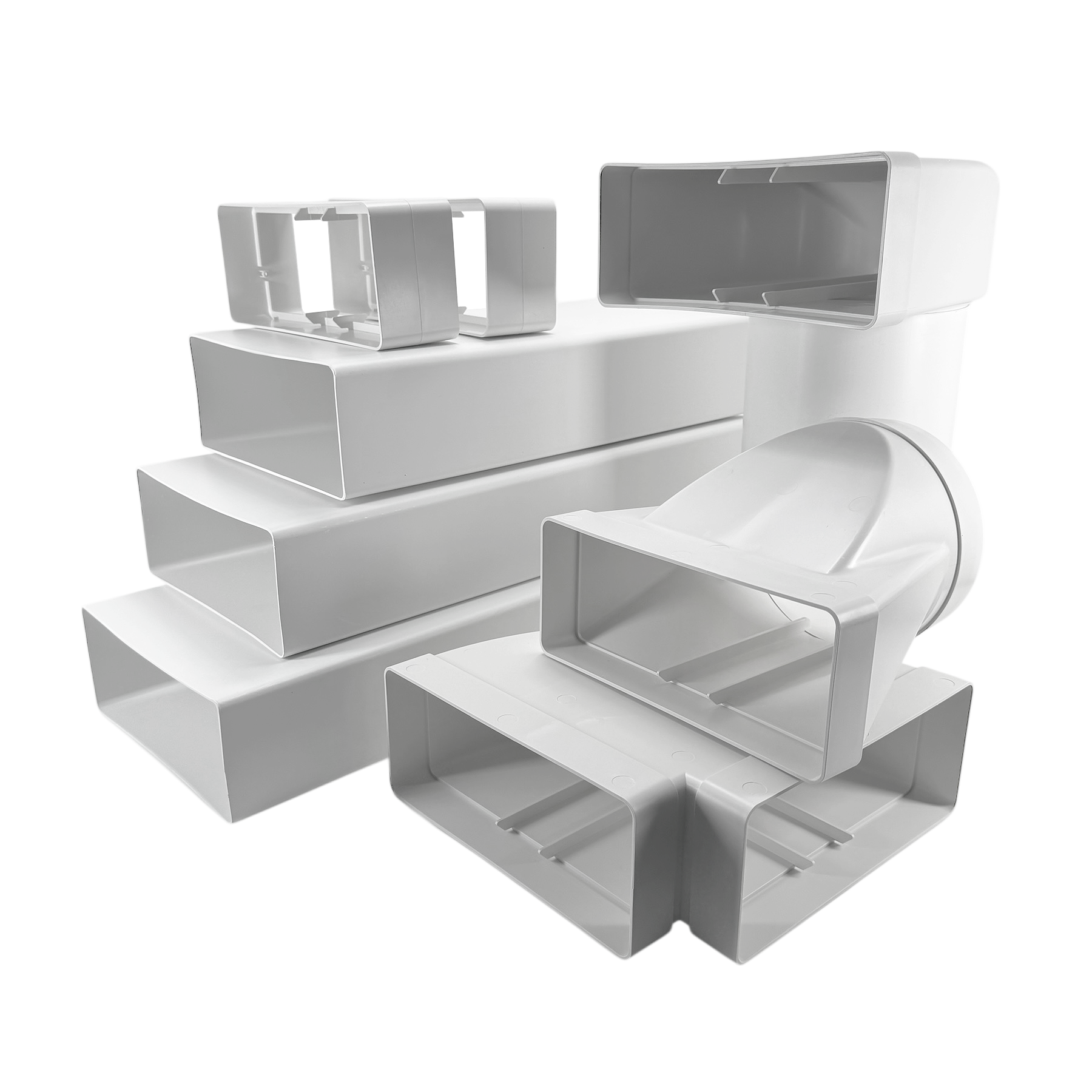 Diverse Formstücke sind vom Umlenkbogen, über verschieden lange Rohre, 90° Bögen, waagerechte und senkrechte Kurven, bishin zum Übergangsstück von rund auf eckig bzw. eckig auf rund verfügbar. Befestigt werden Flachkanäle an der Decke mit sogenannten Flachkanal-Rohrhaltern aus Kunststoff. Passend hierzu führen wir preiswerte Mauerkästen in unserem Shop, damit Sie die Abluft nahezu rückstaufrei nach außen führen können.