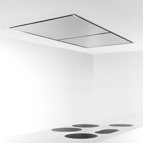 Im relativ seltenen Fall des Einbaus in eine komplett abgehängte Küchendecke ist die Funktion der Deckenhaube optimal. Hier baut sich unterhalb der Decke aus allen Richtungen kommend eine Strömung zum Gerät auf, die auch zur Seite aufsteigenden Dunst anzieht.