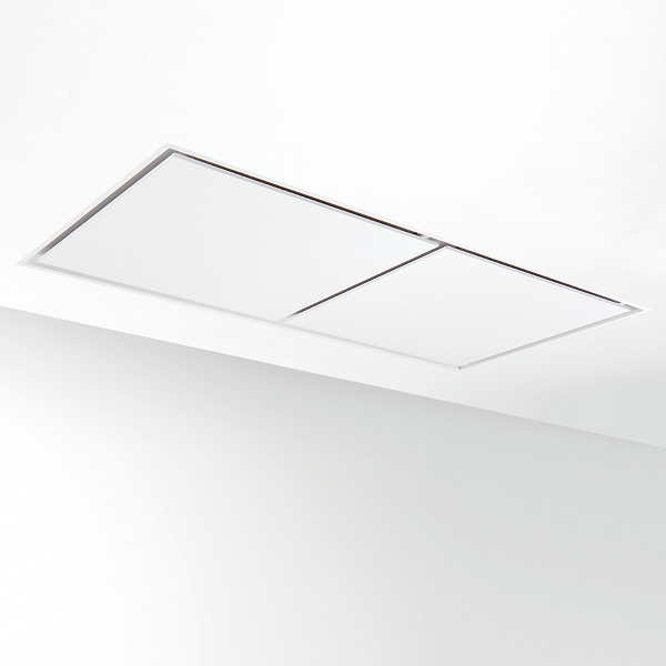 Im relativ seltenen Fall des Einbaus in eine komplett abgehängte Küchendecke ist die Funktion der Deckenhaube optimal. Hier baut sich unterhalb der Decke aus allen Richtungen kommend eine Strömung zum Gerät auf, die auch zur Seite aufsteigenden Dunst anzieht.