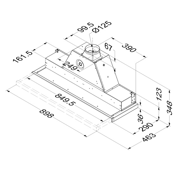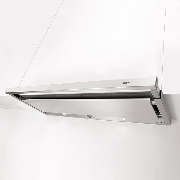 90 cm breite Flachschirmhaube zum Einbau in den Hängeschrank. Mit herausziehbarem Schirm und sehr leisem Motor für Abluft oder Umluft.