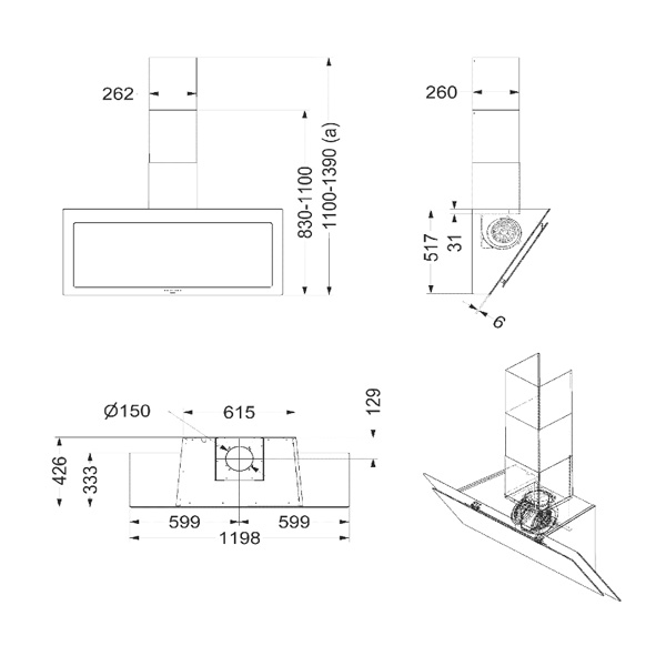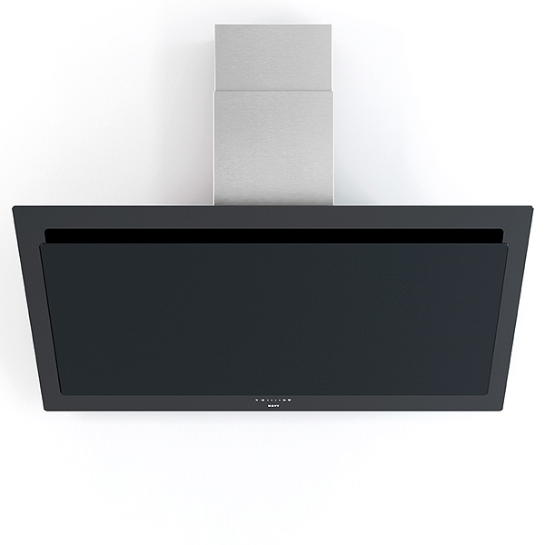 120 cm breite Kopffreihaube zur Montage an der Wand mit schwarzem Glas, LED-Beleuchtung und sehr leisem Gebläse